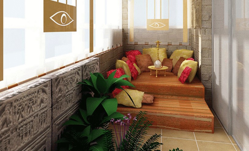 18. Расписной двухместный диванчик, резной столик, узорчатый ковер... Этот балкон оформлен как летняя курительная комната. Он примыкает к пышной гостиной, поэтому все предметы и детали на балконе тщательно подобраны в соответствии с убранством парадного помещения
